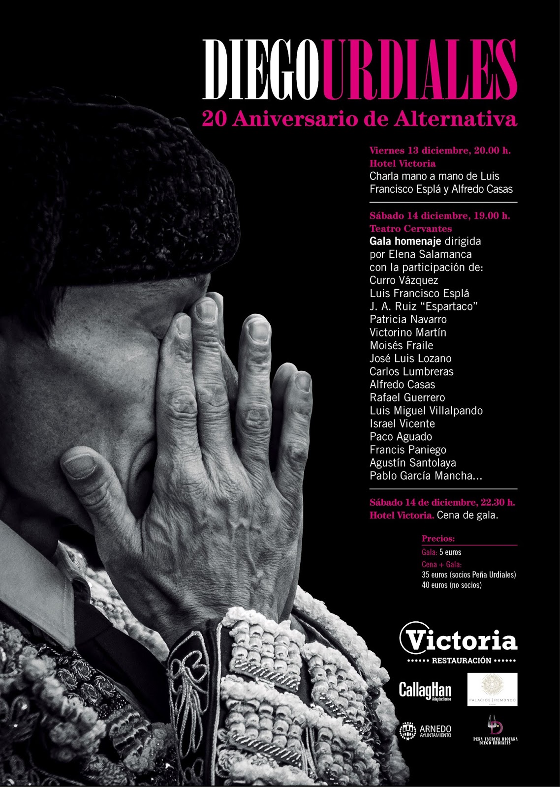 La peña taurina riojana Diego Urdiales acaba de presentar un gran homenaje al torero arnenado en el año en que ha cumplido 20 años de alternativa. La ciudad natal de Diego Urdiales acogerá el 13 y 14 de diciembre dos jornadas en las que participarán reconocidas figuras del toreo, ganaderos, periodistas y personalidades de la sociedad riojana. El primer acto tendrá lugar el viernes 13 de diciembre en el Hotel Victoria (a las 20h.) donde el periodista Alfredo Casas conversará con Luis Francisco Esplá. Un día después, una gran gala homenaje en el Teatro Cervantes de Arnedo (a las 19h), conducida por la periodista Elena Salamanca, contará con la participación, entre otros, de los toreros Curro Vázquez, Luis Francisco Esplá, Juan Antonio Ruiz 'Espartaco'; los ganaderos Victorino Martín, Moisés Fraile, José Luis Lozano y Carlos Lumbreras; los periodistas Patricia Navarro, Paco Aguado, Pablo García Mancha y Alfredo Casas; personas que han influido en la carrera del riojano como Rafael Guerrero, Luis MIguel Villalpando e Israel VIcente. También estarán personalidades de la sociedad riojana como el reconocido cocinero Francis Paniego y el enólogo y responsable de una de las mejores bodegas de La Rioja Agustín Santolaya. La jornada concluirá con una cena. Las jornadas, organizadas por la peña taurina riojana Diego Urdiales, cuentan con el apoyo del Ayuntamiento de Arnedo, Victoria Restauración, Zapatos Callaghan y Bodegas Palacios Remondo.