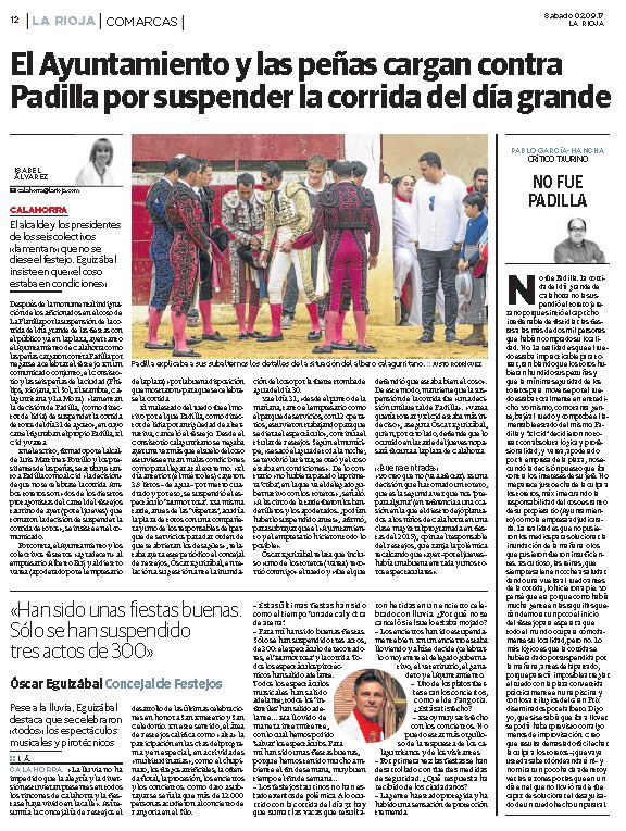 No fue Padilla. La corrida del día grande de Calahorra no la suspendió el torero jerezano porque sintió el capricho irrefrenable de fastidiar las fiestas a las más de dos mil personas que habían comprado su localidad. No. La realidad es que el ruedo estaba impracticable para torear, tan blando que los toros hubieran hundido sus pezuñas y que la mínima seguridad de los toreros para moverse por el ruedo estaba totalmente en entredicho. Yo mismo, como tanta gente, bajé al ruedo y comprobé el lamentable estado del mismo. Padilla y ‘El Cid’ decidieron no torear con absoluta lógica y profesionalidad, y Varea, apoderado por la empresa de la plaza, no secundó la decisión puesto que iba contra los intereses de su jefe. No me parece justo echarle la culpa a los toreros, máxime cuando la responsabilidad del coso es tanto de su propietario (Ayuntamiento) como la empresa adjudicataria. La realidad es que no pusieron los medios para solucionar la inundación de la mañana o los que pusieron fueron insuficientes. Es curioso, las reinas, que siempre salen en coche a saludar dando una vuelta al ruedo antes de la corrida, lo hicieron a pie. Yo pensé que era porque como había mucha gente en las taquillas querían demorar un poco el inicio del festejo para esperar a que todo el mundo ocupara cómodamente su localidad, pero no. Lo más lógico es que la corrida se hubiera dado por suspendida por la mañana, antes del apartado, porque parecía imposible arreglar el ruedo con la plaza convertida prácticamente en una piscina y con los artilugios del Gran Prix diseminados por el albero. Digo yo, que si se sabía que iba a llover se podía haber previsto con algo menos de improvisación. Creo que resulta demasiado fácil echar la culpa a los toreros -¡qué vaya usted a saber dónde andarán!- y no mirar un poco hacia adentro y ver las razones por las que en un día en el que no llovió nadie fue capaz de solucionar el desaguisado de un ruedo hecho un patatal. o Este artículo lo he publicado en Diario La Rioja