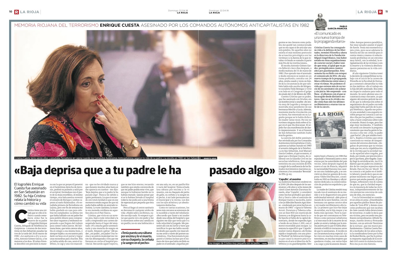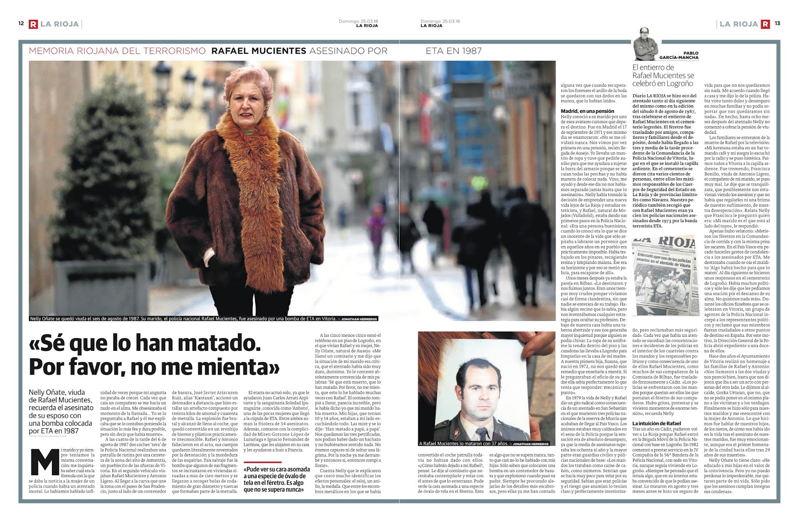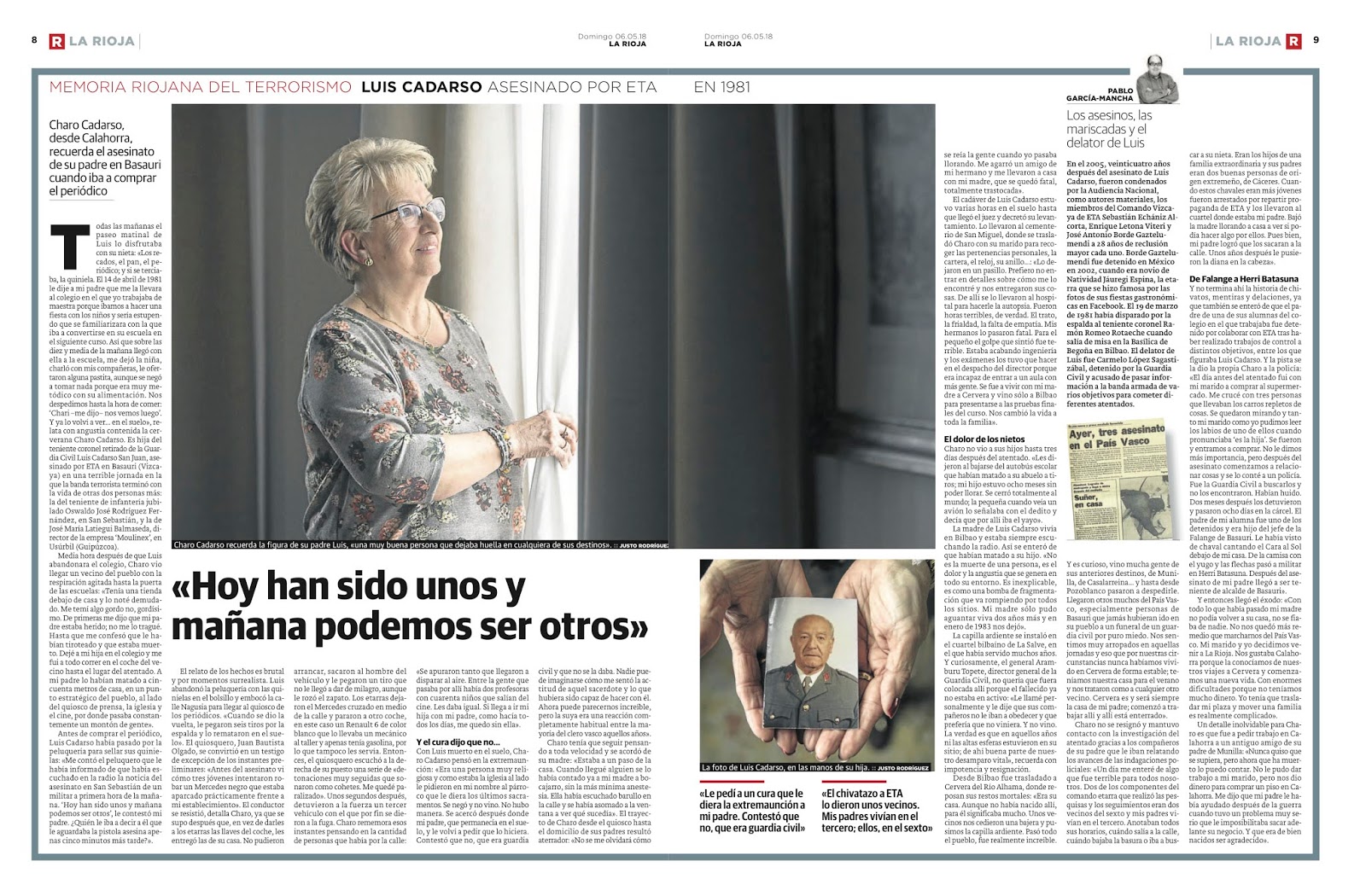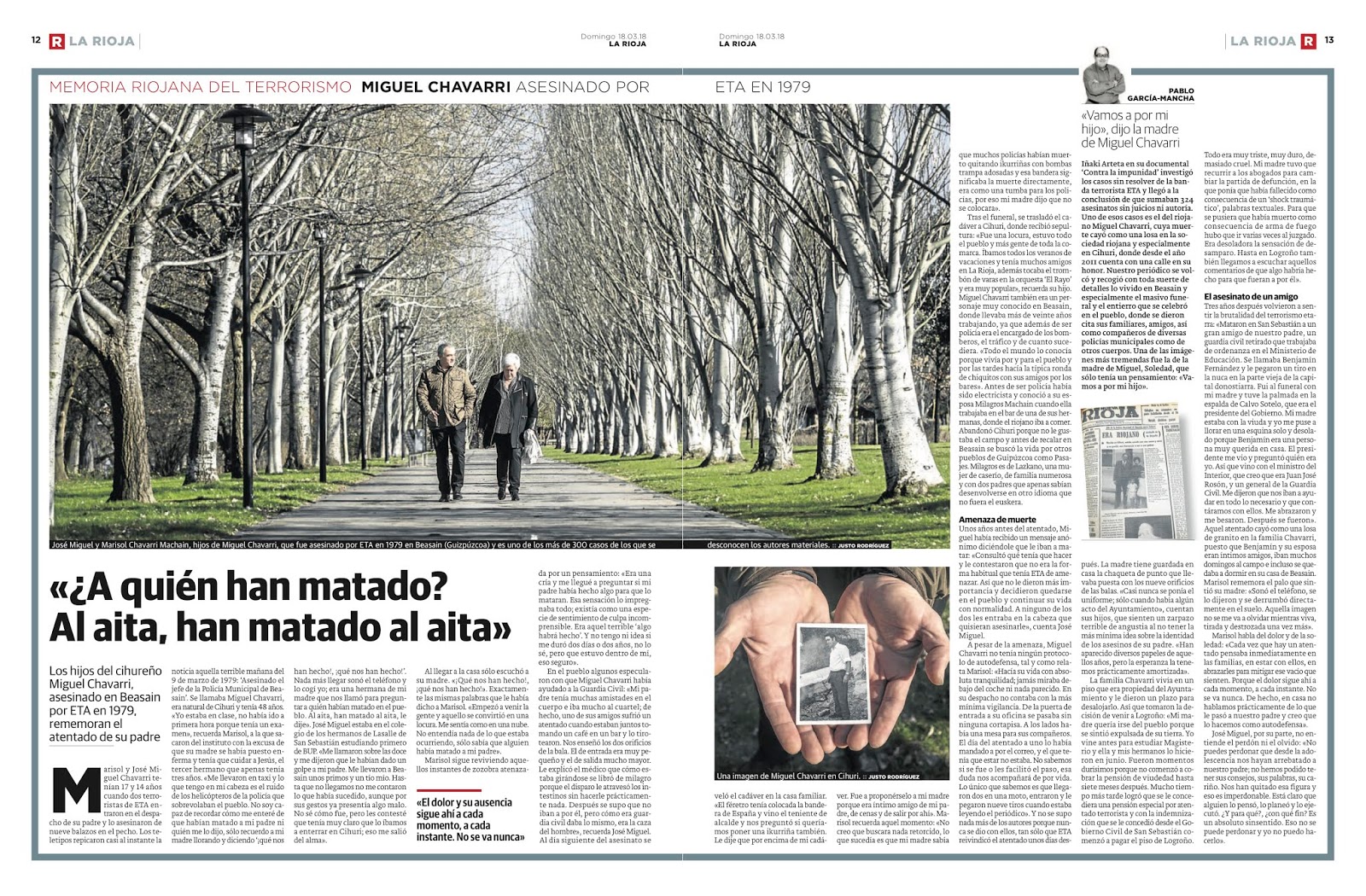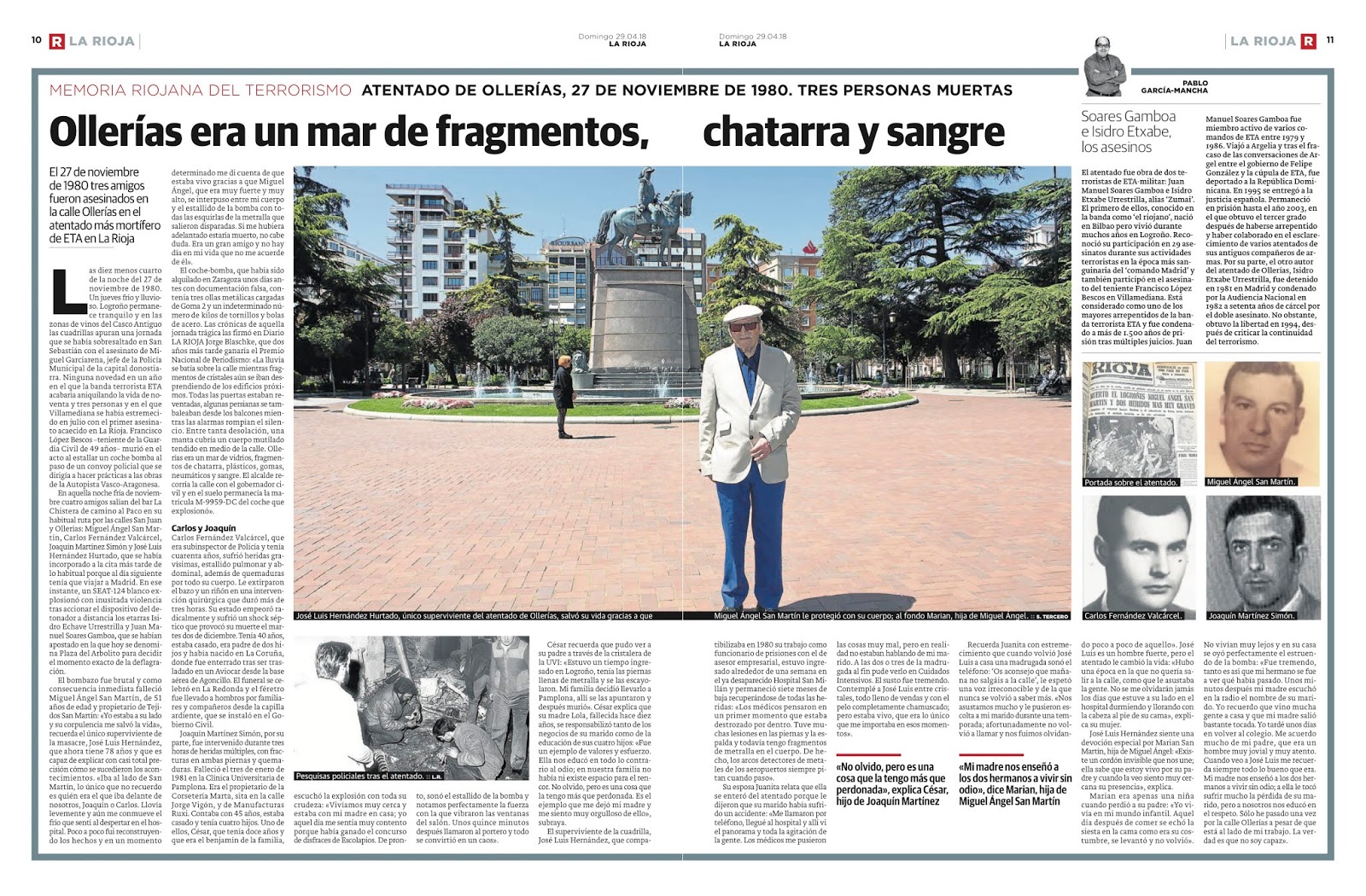 La serie "Memoria Riojana del Terrorismo" es un conjunto de reportajes escritos por Pablo García Mancha y publicados en el periódico larioja.com. Esta serie se centra en documentar y narrar las historias personales y el impacto del terrorismo en La Rioja, España, con un enfoque particular en las víctimas locales y sus familias. Los artículos exploran los atentados terroristas cometidos por grupos como ETA, GRAPO, y otros, destacando tanto el dolor como la resiliencia de las personas afectadas.